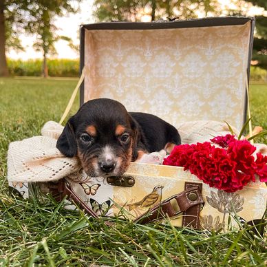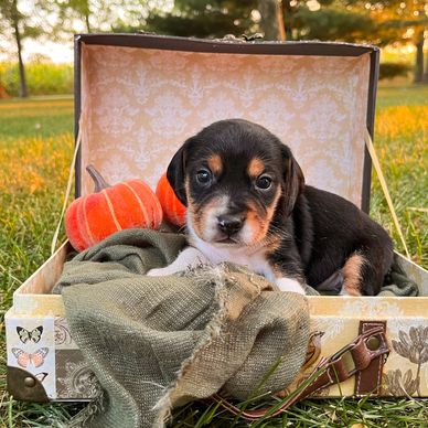 This curious Pocket Beagle Puppy is Gypsy. She was born on August 22nd, 2025 and will be ready for her forever home when she is 8 weeks old. Her mother is Krystal and her father is Buddy. She will weigh from 20-25 lbs. when she is fully grown. Gypsy is eligible to be registered with the North American Purebred Registry.