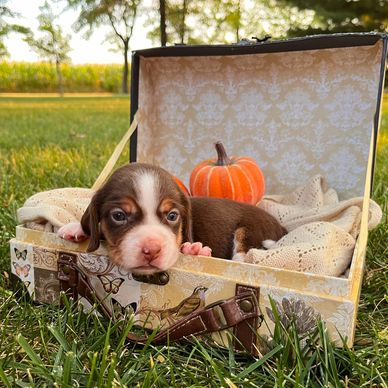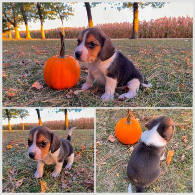This beautiful Pocket Beagle Puppy is Lacey. She was born on August 19th, 2025 and will be ready for her forever home when she is 8 weeks old. Her mother is Kiah and her father is Buddy. She will weigh from 20-25 lbs. when she is fully grown. Lacey is eligible to be registered with the North American Purebred Registry.