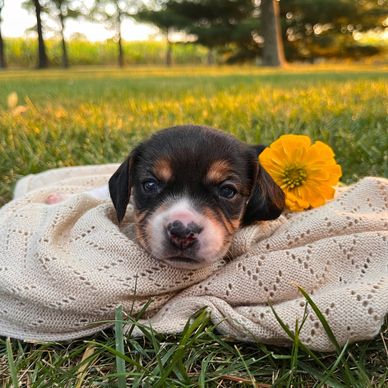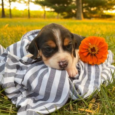 This sweet Pocket Beagle Puppy is Jasmine. She was born on September 10th, 2025 and will be ready for her forever home when she is 8 weeks old. Her mother is Flopsy and her father is Andre. She will weigh from 20-25 lbs. when she is fully grown. Jasmine is eligible to be registered with the North American Purebred Registry.